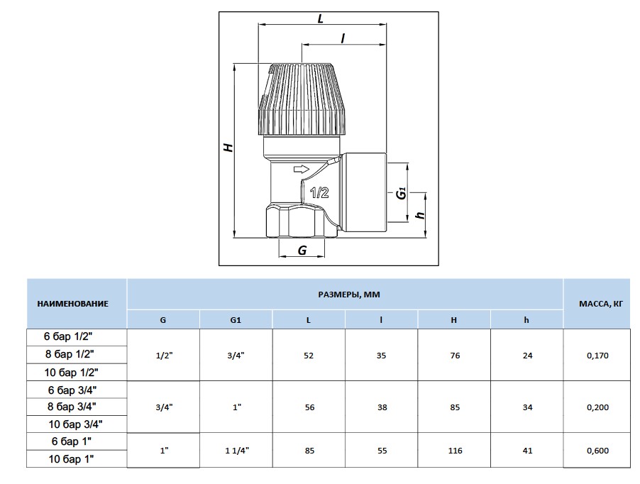DN входного патрубка — 20 мм (3/4"). Сбросной патрубок — 1".